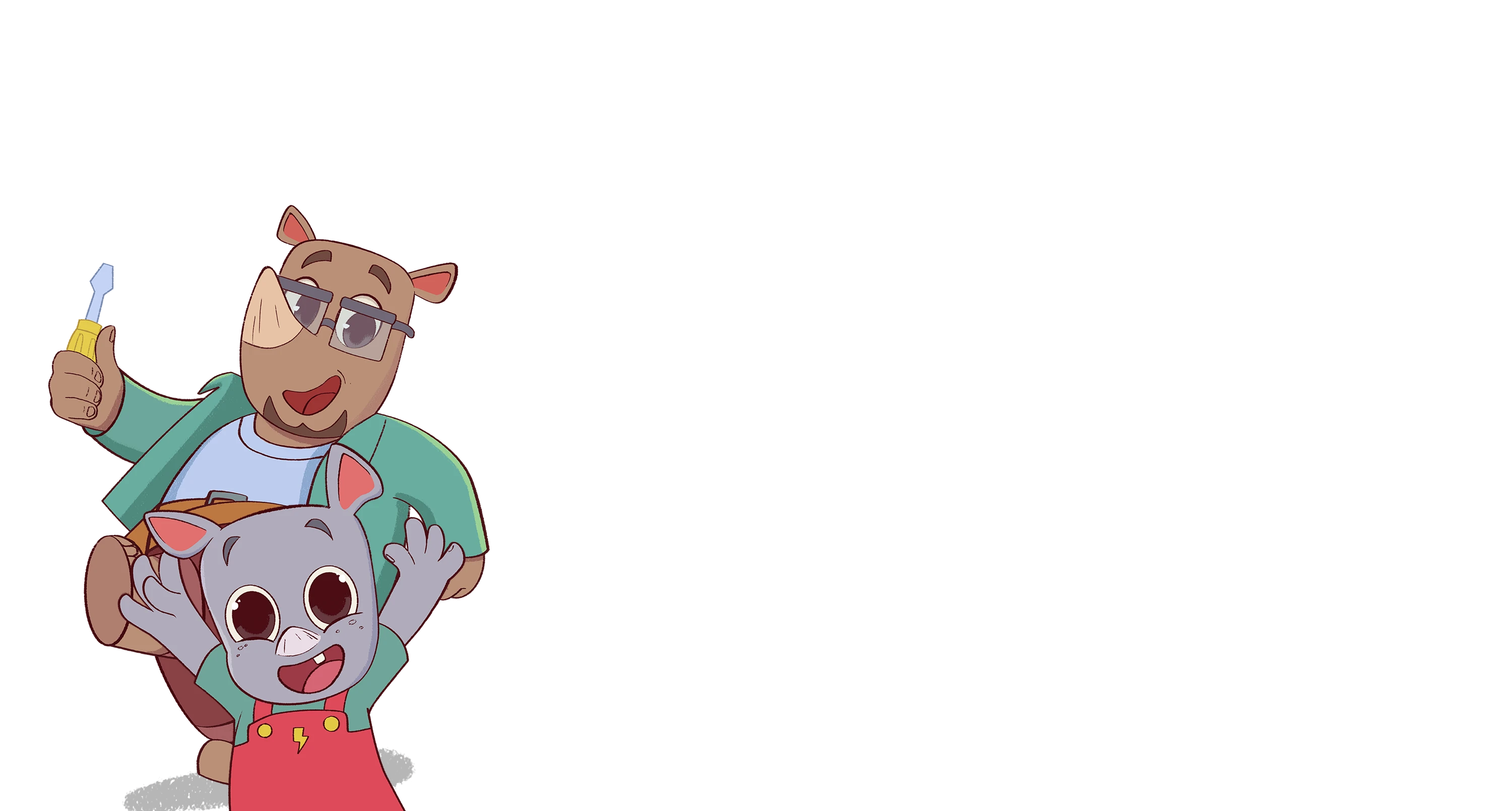 Although Rhino Dad is a heavy equipment driver, he has a flexible schedule that allows him to be at home more than most parents. Dad is very curious and enjoys research and investigation, as well as keeping things organized. He has a workshop in the garage where he likes to tinker and invent new contraptions. He looks after family safety and happily takes on all the handyman issues for the house. Dad loves it when Mom or one of the kids has an idea for a project that needs his construction expertise. Rhino Dad possesses a high level of emotional intelligence and, like Rhino Mom, is quick to recognize the emotional states of his children. He is also very sensitive and doesn’t mind sharing or showing his feelings.