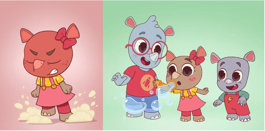 “Stomp! Stomp! Rhinos!” season one's central topic is anger. It was chosen because research and professional experience shows that it’s one of the most challenging emotions in preschoolers and their parents. Season one runs across 13 seven-minute episodes and helps children and their families learn how to normalize and relieve “big” emotions by showcasing tips that can be incorporated into everyday family life.
