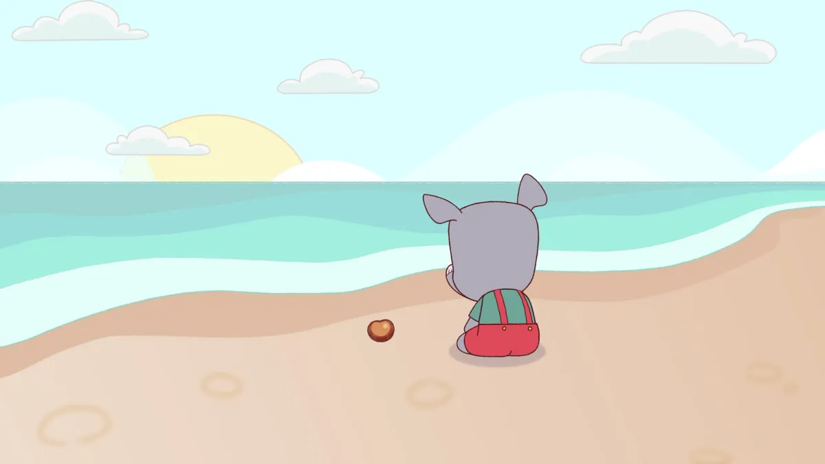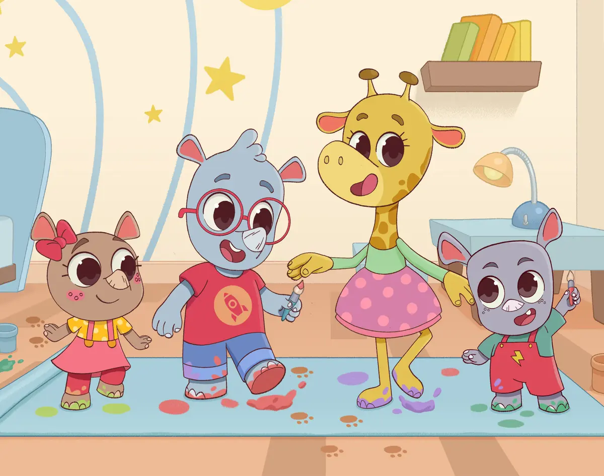 Neighbor Dina has come over to play with the little rhinos. She has a roll of blue paper and a bucket of paint supplies. Gathered in Noah’s room, the children decide they are going to paint the bottom of the ocean floor. Noah paints seaweed. Ela paints an octopus. And Ron starts to paint an elaborate seahorse – that is, until Bobo walks across his work and smears it. Ron was so proud of his painting. Now he’s so furious that he tears the paper. Noah steps in and teaches his little brother a sensory calming activity called “finger breathing.” Combined with slow breathing, this exercise helps Ron feel better. Once Ron’s emotions are soothed, Dina uses tape and paint to mend the torn seahorse and turn it into a new, and even better, red crab.
